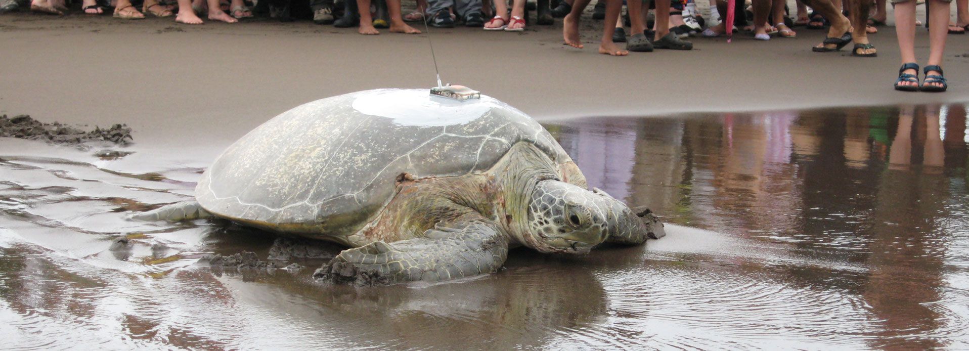 Since most research conducted on marine turtles has been carried out on nesting beaches and well over 90% of a sea turtle’s life is spent in the water — feeding, mating, migrating and doing whatever else a sea turtle does when no one is watching, we are missing important information that can help us better protect sea turtles. In particular, to adequately protect sea turtles in all their habitats, we must learn more about their migratory patterns, their behavior at sea, where their marine habitats are located, how the turtles use these different habitats, and the migration routes turtles travel between habitats. Research into the behavior and life cycle of marine turtles has taught us that these creatures do not generally nest and feed in the same area. We now know that sea turtles are highly migratory, often traveling hundreds or even thousands of miles between the beaches where they lay their eggs and the foraging (feeding) grounds where they spend much of their time at sea.