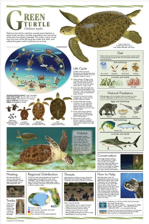 The Florida Sea Turtle Life History Posters Project was originally funded by a grant from the Sea Turtle License Plate Program. This project involved the development and distribution of a life history poster for each of the five species of sea turtles found in Florida.