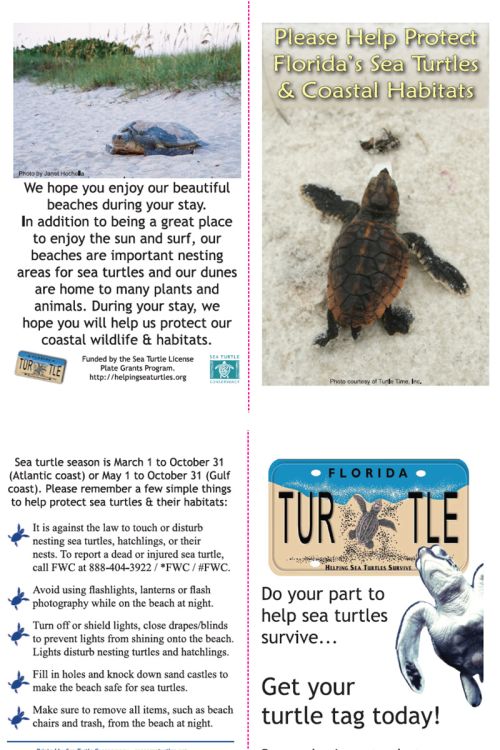 Begun in 2008, the Florida Sea Turtle Educational Resource Warehouse Project was originally funded by a grant from the Sea Turtle License Plate Program. In 2010, the project was funded in part through the National Fish and Wildlife Foundation’s Oil Fund for Wildlife. In 2015, STC received funds from the Sea Turtle License Plate Grants Program to reprint the materials. The project involved the development and distribution of outreach and educational materials. These items were provided at no cost to Florida sea turtle groups, coastal businesses, condo associations, or any other groups requesting the materials. Both the Table Tents and Door Hang Tags have a space for the distributing group to put its contact information.