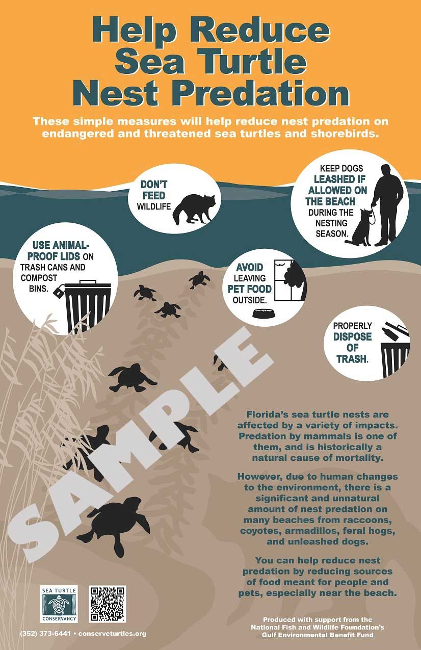 Around the globe, sea turtle eggs and hatchlings are a natural food source for many predators. However, due to human changes in the environment, there is a significant and unnatural amount of nest predation on many beaches from raccoons, coyotes, armadillos, feral hogs, and unleashed dogs. For example, human trash left near the beach unwittingly calls non-native species to the beaches to look for food. People living near the beach may intentionally or unintentionally feed nest predators by leaving pet food outside or by having unsecured garbage containers near their home.