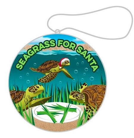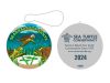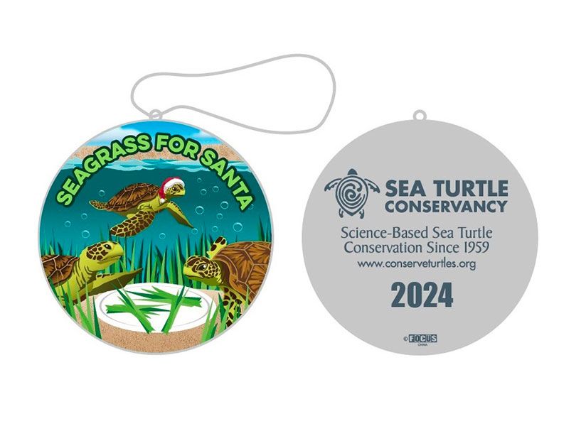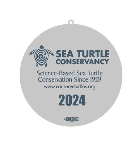 The 2024 ornament features 3 sea turtles eating seagrass. The slogan “Science-Based Sea Turtle Conservation Since 1959” and the year 2024 are engraved on the back.