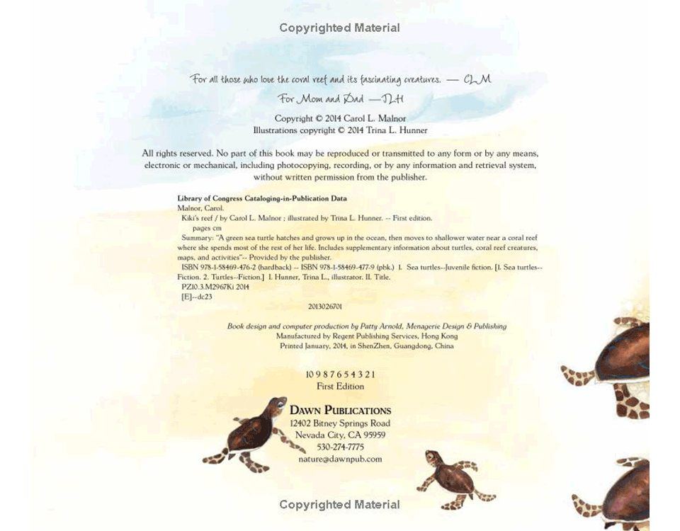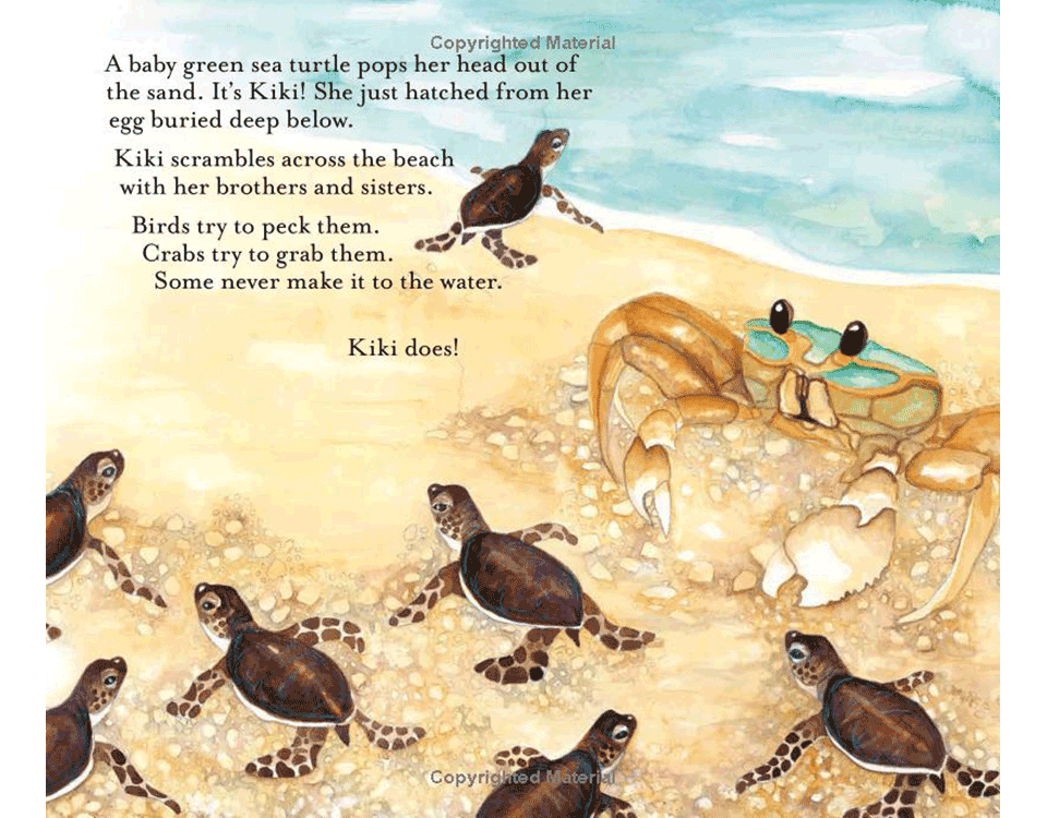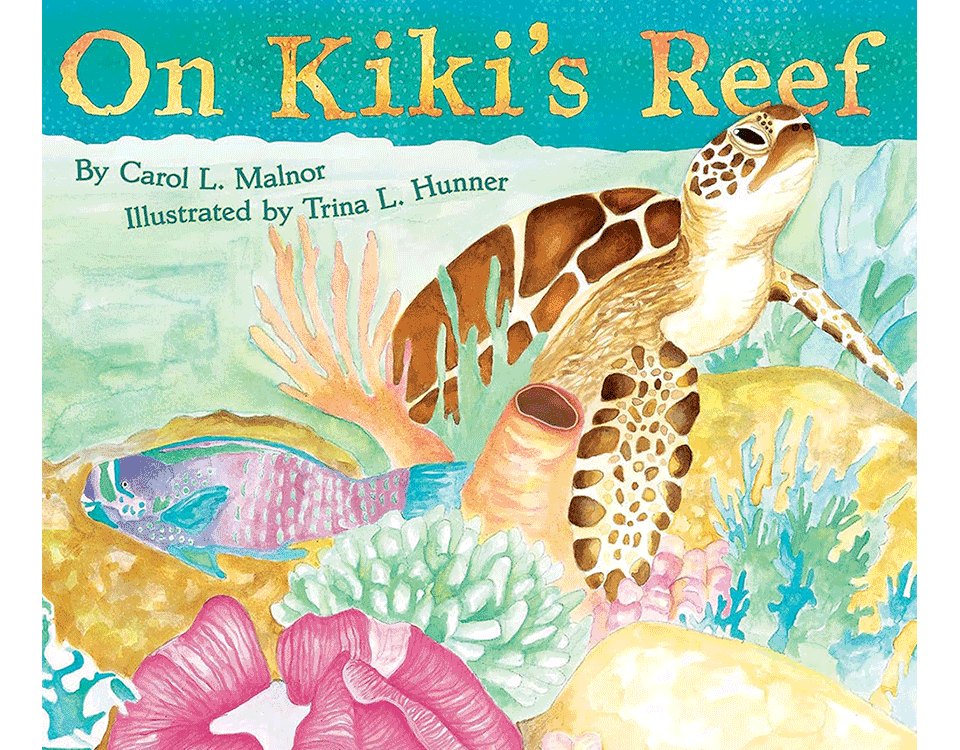 By Carol L. Malnor, illustrated by Trina L. Hunner. A tiny baby sea turtle scrambles across the sandy beach and into the sea. Floating far out in the ocean, Kiki is becoming a gentle giant. She swims to shallower water where a rainbow of corals puts on a show. Kiki adopts the busy coral reef as her new home and discovers fish of all sizes and lots of surprises! There’s lots of teamwork going on too, including a gang of tangs that clean up the algae growing on her shell. But something calls her back to the beach . . . and the cycle of life continues. The book also offers a concise beginner’s guide to sea turtles and coral reefs, plus a variety of “teaching treasures” for further learning. David Godfrey, the Executive Director of Sea Turtle Conservancy, is quoted on the back cover.