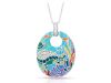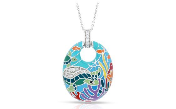 The “Sea Turtle” collection takes us underwater to a tropical paradise of multicolored enamel and cubic zirconia’s Backdropped in aqua enamel, this sterling silver pendant shows a colorful world of sea creatures and coral reefs with cubic zirconia’s. Sterling silver chain is included 16″, 18″ or 20″.