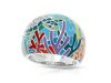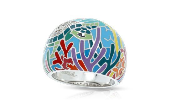 The “Sea Turtle” collection takes us underwater to a tropical paradise of multicolored enamel and cubic zirconia’s. Backdropped in aqua enamel, this sterling silver ring shows a colorful world of sea creatures and coral reefs with cubic zirconia accents.