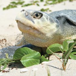 Sea turtles do not have teeth, but their jaws have modified “beaks” suited to their particular diet. They do not have visible ears but have eardrums covered by skin. They hear best at low frequencies, and their sense of smell is excellent. Their vision underwater is good, but they are nearsighted out of water. Their streamlined bodies and large flippers make them remarkably adapted to life at sea. However, sea turtles maintain close ties to land. Females must come ashore to lay their eggs in the sand; therefore, all sea turtles begin their lives as tiny hatchlings on land.