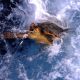 Leatherback turtles are the largest of all sea turtles measuring between 4 to 6 feet (130 – 183 cm) and weighing 660 to 1,100 pounds (300 – 500 kg). The largest leatherback ever recorded was almost 10 feet (305 cm) from the tip of its beak to the tip of its tail and weighed in at 2,019 pounds (916 kg). Their head has a deeply notched upper jaw with two cusps and their flippers are without claws. The Leatherback is the only sea turtle that lacks a hard shell. Its carapace is large, elongated and flexible with 7 distinct ridges running the length of the animal, and composed of a layer of thin, tough, rubbery skin, strengthened by thousands of tiny bone plates, the carapace does not have scales, except in hatchlings. Adult carapaces are dark grey or black with white or pale spots, while the plastron is whitish to black and marked by five ridges, while hatchlings have white blotches on carapace.