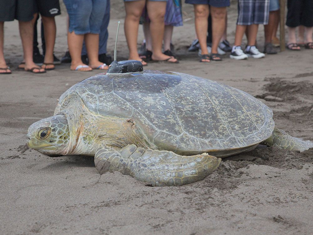 Adele is an adult female green sea turtle encountered nesting on July 11, 2011, at Tortuguero beach. She measured 103.3 cm in curved carapace (shell) length. A satellite tag was applied after she finished nesting.