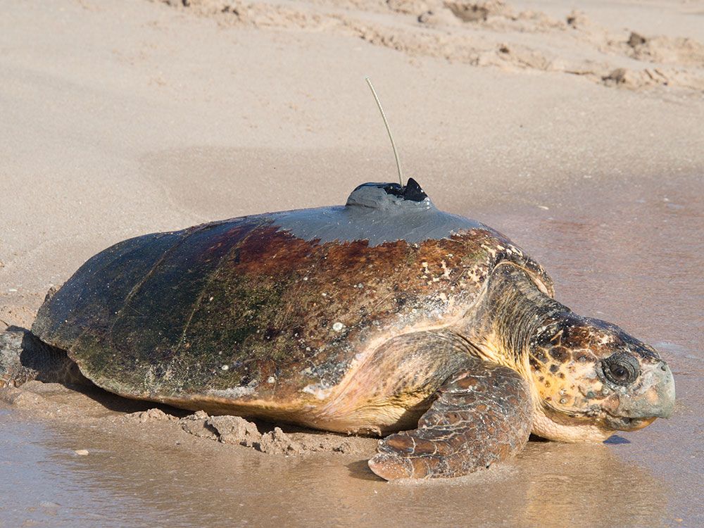 An adult female loggerhead sea turtle released with a satellite transmitter on July 29, 2018 from the Archie Carr National Wildlife Refuge, Florida. She measured 102.7 cm curved carapace (shell) length and 90.6 cm curved carapace width. Bion (Believe It Or Not) is taking part in the 2018 Tour de Turtles and was named by her sponsor, Ripley’s Aquariums.