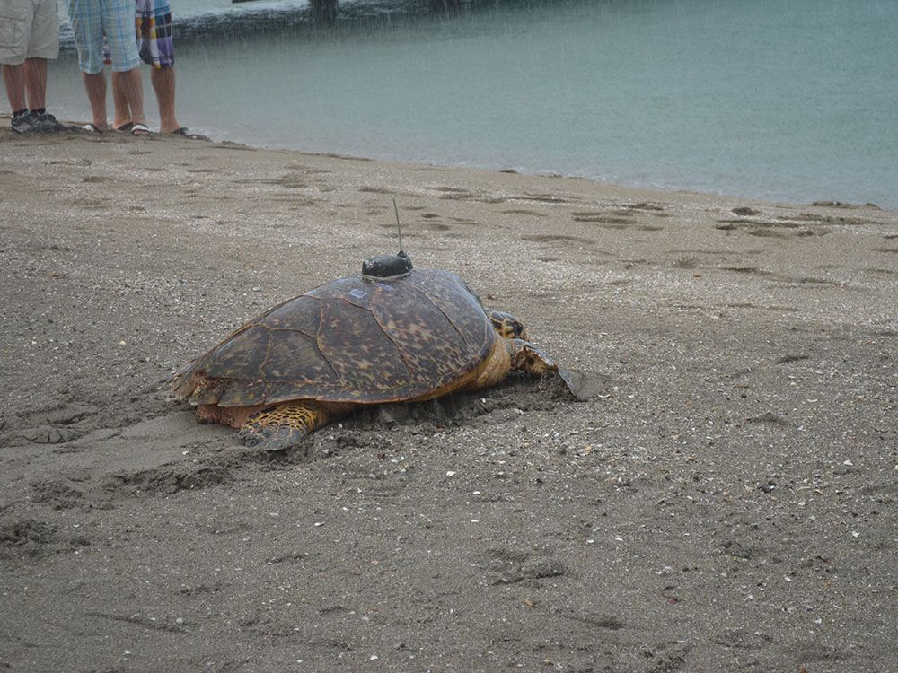 Coral is an adult hawksbill sea turtle that was encountered nesting on Lover’s Beach, Nevis, on August 3, 2011. Coral took part in the 2011 Tour de Turtles marathon. A satellite tag was applied after she nested.