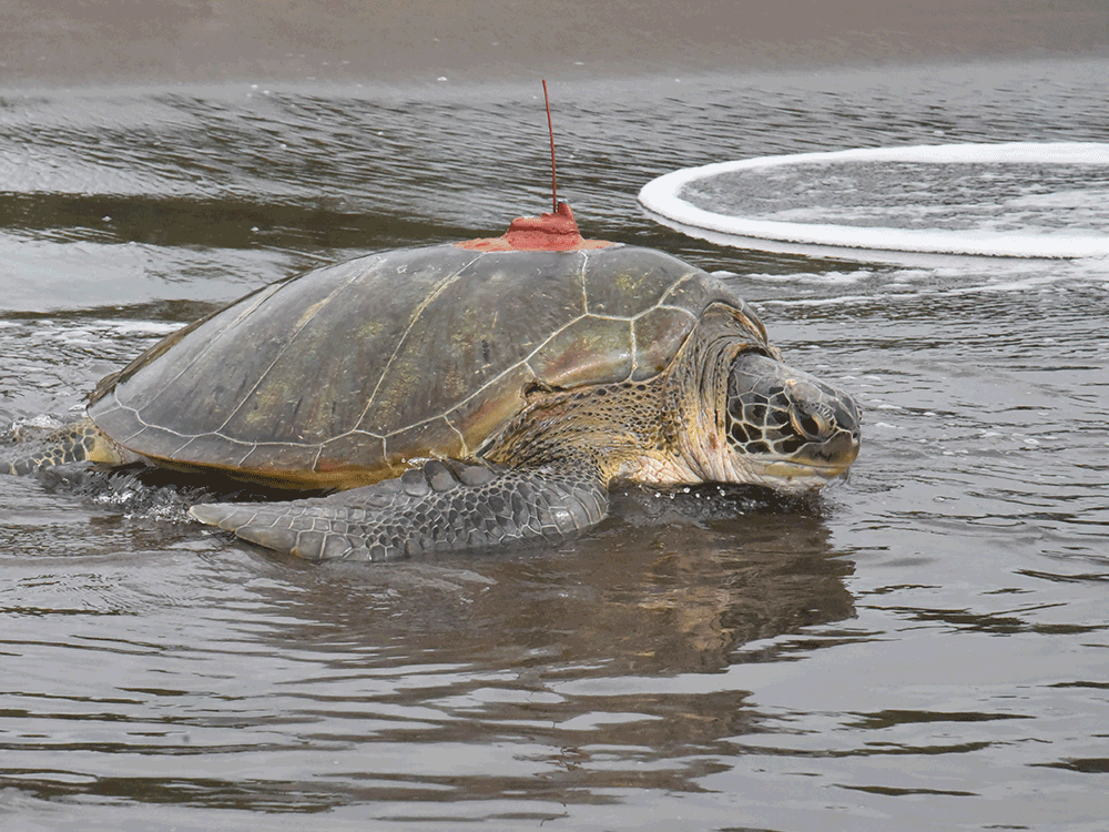 An adult female green sea turtle released with a satellite transmitter on September 20, 2023 from Tortuguero National Park in Costa Rica. She measured 100.8 cm curved carapace (shell) length and is part of a project to track green turtles nesting on the beach at the southern end of Tortuguero National Park. Esperanza wa named by her Sponsor, NOGU.