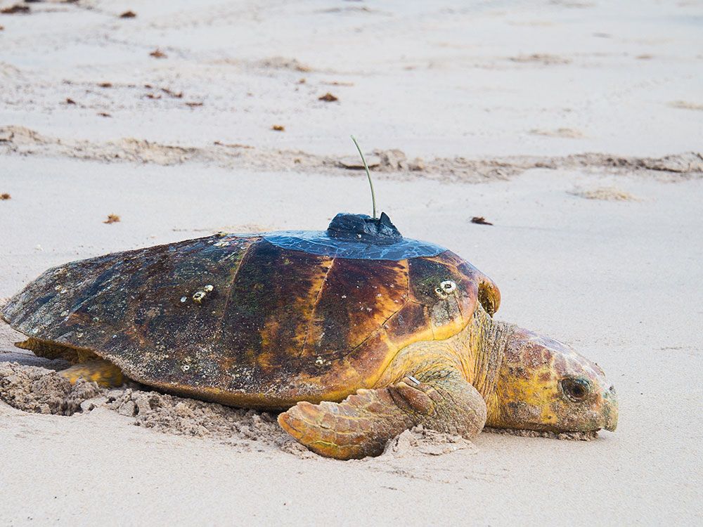 Gim is an adult female loggerhead sea turtle released with a satellite transmitter on July 23, 2020 from the Archie Carr National Wildlife Refuge, Florida. She measured 93.3 cm curved carapace (shell) length and 90.3 cm curved carapace width. Gim took part in the 2020 Tour de Turtles and was named by her sponsor, gimMe Snack.