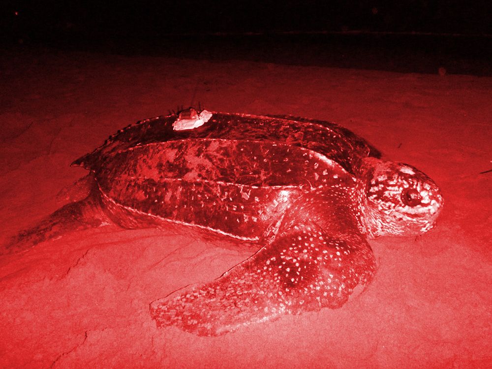 An adult female leatherback sea turtle released with a satellite transmitter from Chiriqui Beach, Panama on May 26, 2015. Insolites took part in the 2015 Tour de Turtles.