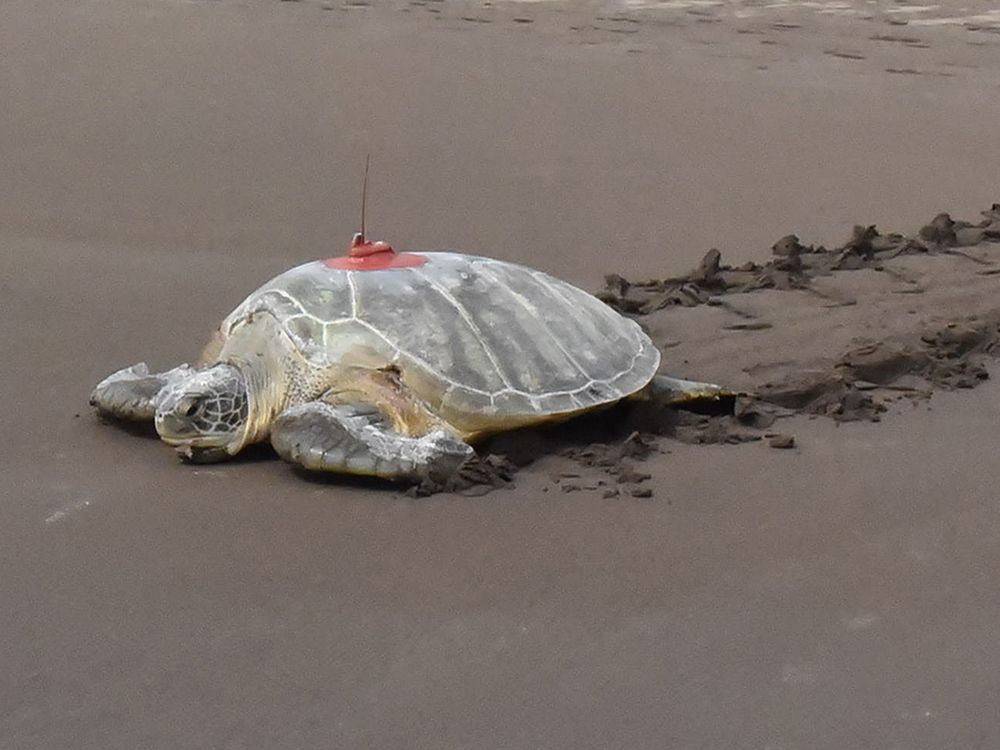 An adult female green sea turtle released with a satellite transmitter on September 20, 2022 from Tortuguero National Park in Costa Rica. She measured 95.9 cm curved carapace (shell) length and is part of a project to track green turtles nesting on the beach at the southern end of Tortuguero National Park.